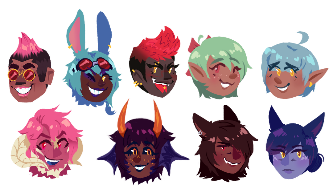 Simple little heads in a lineless style. These can be more detailed, but won't be as readable on a smaller scale.